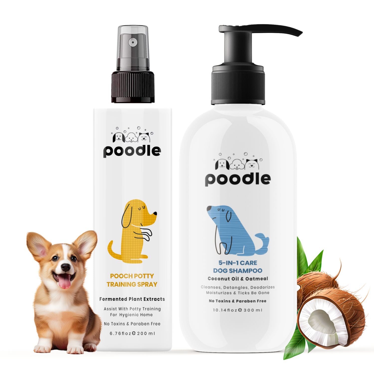 Poodle-5-in-1-Benefits-Dog-Shampoo 300ml + Puppy Potty Training Spray 200ml (Combo Set 2-in-1) - Healthy Coat and Puppy Training | OATMEAL AND COCONUT OIL | PLANT BASED